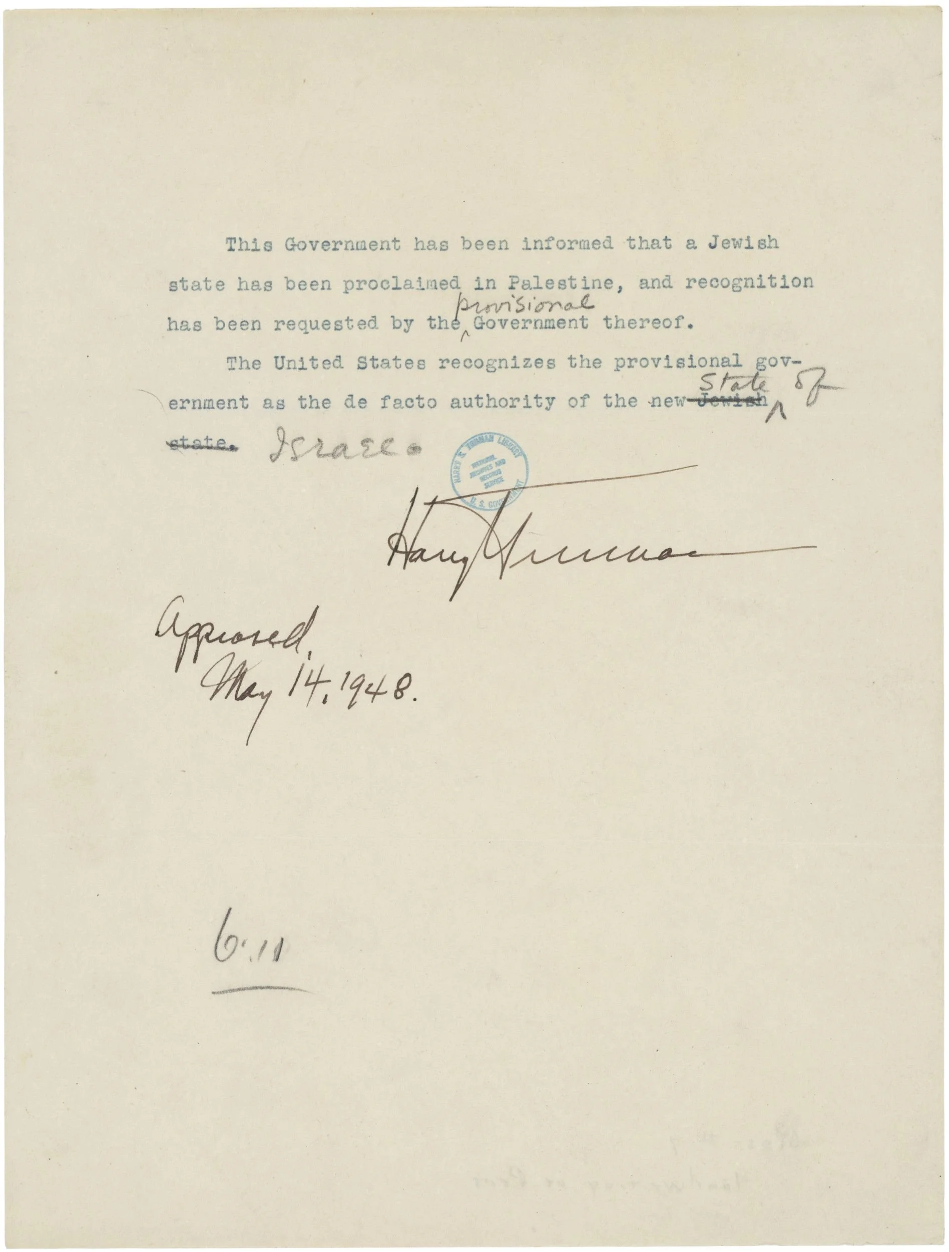 This Government has been informed that a Jewish state has been proclaimed in Palestine, and recognition has been requested by the provisional Government thereof.
